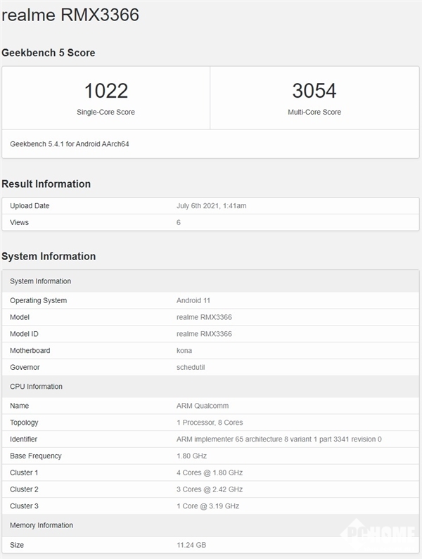 今天上午,有网友曝光称,realme旗下有一款机型代号为“RMX3366”的新机在Geekbench数据库现身,其中显示该机将搭载目前大热的骁龙870处理器,同时还拥有12GB内存,单核跑分为1022、多核为2054分。