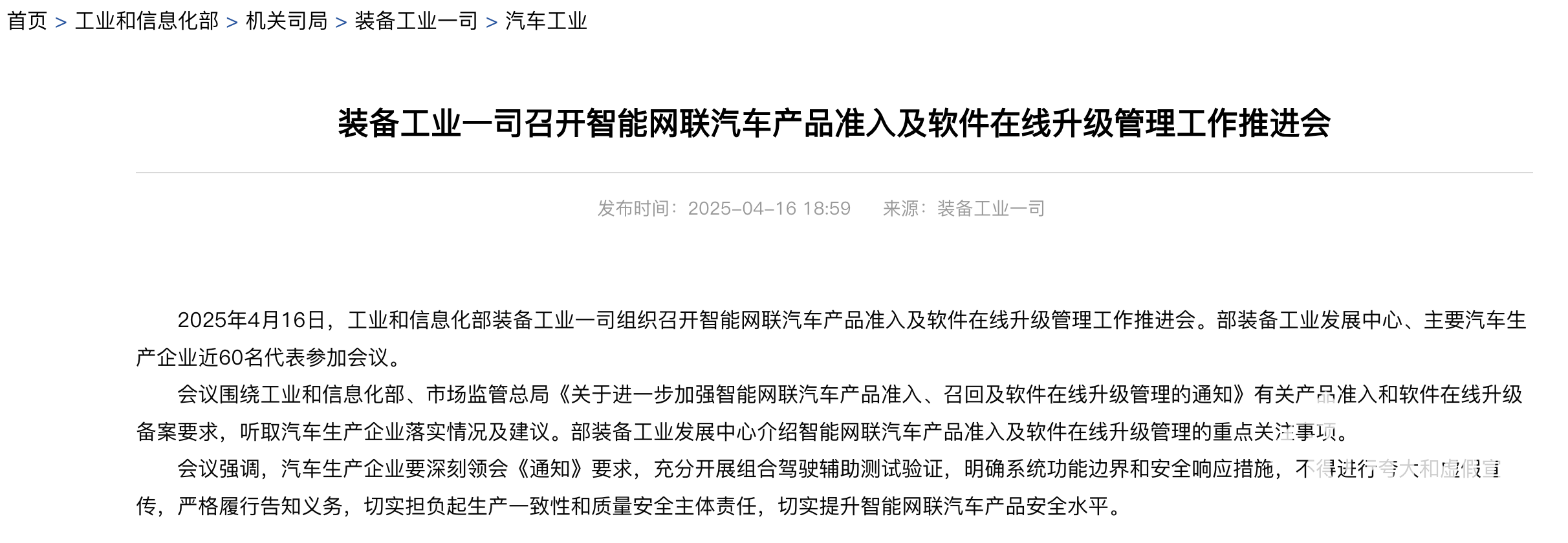 2025年4月16日,工信部召开智能网联汽车产品准入及软件在线升级管理工作推进会。会议强调,汽车生产企业不得对智能驾驶功能进行夸大和虚假宣传。