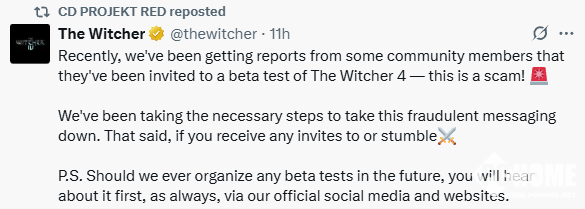 游戏《巫师(The Witcher)》官方在其社交平台,对一些社区成员收到了《巫师4》Beta测试邀请的举报做出回应,称这是一个骗局,还表示,已采取必要措施删除这些欺诈信息,并呼吁广大网友有关该游戏的任何Beta测试可在官方社交媒体和网站第一时间获悉。