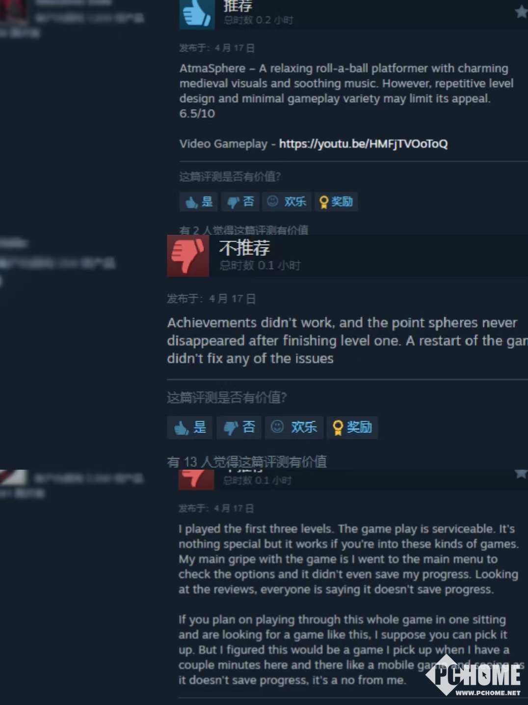 据Steam网站数据展示,《AtmaSphere》近期评价褒贬不一,有网友认为它是一款拥有迷人的中世纪视觉风格和舒缓音乐的放松型滚珠平台游戏。然而,重复的关卡设计和缺乏游戏玩法多样性可能限制其吸引力。但也有网友表示成就没有生效,且在完成第一关后,积分球从未消失,重新启动游戏并未修复任何问题,并且游戏进度保存不了等问题。