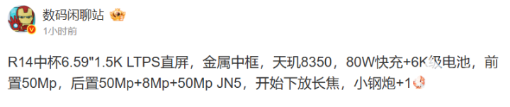 据爆料人@数码闲聊站发布的消息显示,该款机型采用6.59"1.5K LTPS 直屏;金属中框;天玑8350处理器;80W快充+6K级电池;前置50Mp镜头;后置50Mp+8Mp+50Mp JN5镜头。