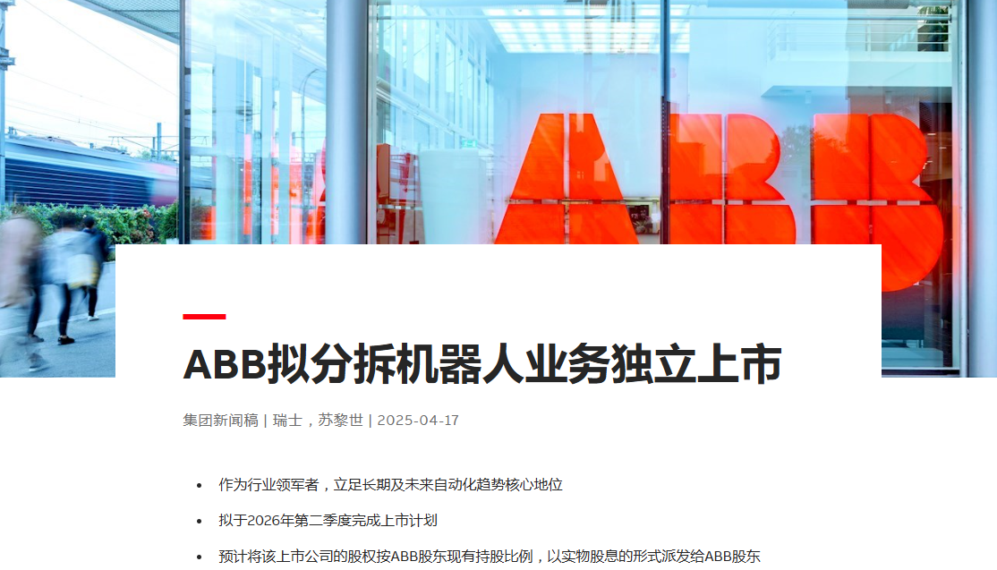 4月17日消息,ABB官方宣布,将启动相关程序,拟提交2026年年度股东大会审议,决定对其机器人业务单元实施100%分拆,目标于2026年第二季度,推动该业务作为独立上市公司启动上市交易。