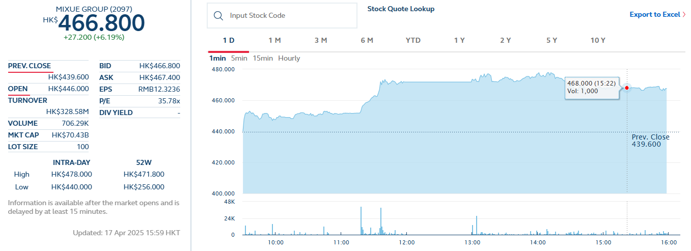 4月17日消息,港股消费股持续走强,蜜雪集团涨7.23%,报471.4港元,股价再创历史新高。泡泡玛特午后拉升,涨逾5%,股价创历史新高。