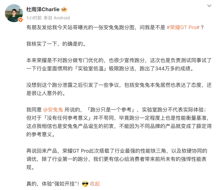 荣耀GT系列产品经理杜雨泽则回应称,荣耀GT Pro是负责测试同事试了一下行业里面惯用的“实验室低温”极限跑分法,跑出了344万多的成绩。
