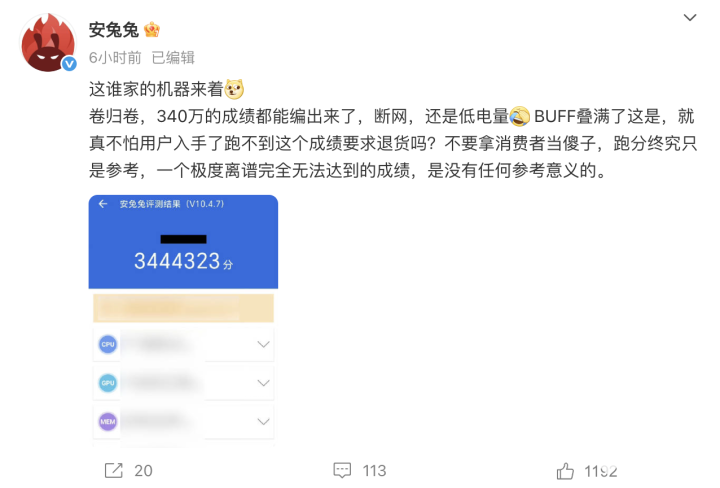对此,安兔兔官微发文称:“这谁家的机器来着?卷归卷,340万的成绩都能编出来了,断网,还是低电量,BUFF叠满了这是,就真不怕用户入手了跑不到这个成绩要求退货吗?不要拿消费者当傻子,跑分终究只是参考,一个极度离谱完全无法达到的成绩,是没有任何参考意义的。”