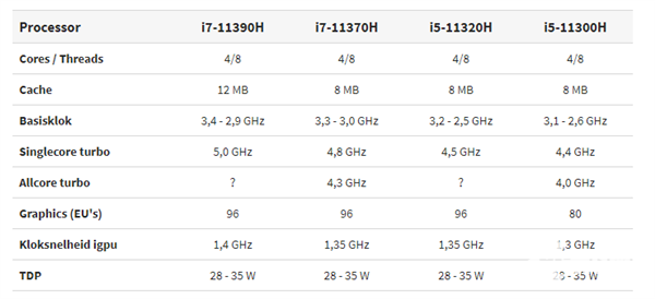 H35系列型号不多,之前首发的时候实际上主要是酷睿i5-11300H、酷睿i7-11370H两款,现在发布的则是主要是酷睿i5-11320H、酷睿i7-11390H两款。