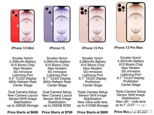 价格方面,iPhone 13系列四款新机起售价分别为699/799/999/1099美元,也就是说最低只要不到4600元人民币就能买到最新款iPhone。