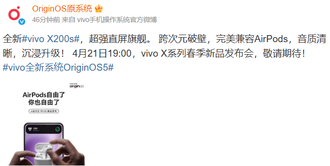 4月18日消息,今日vivo官方为vivo X系列春季新品发布会预热发布了vivo X200s手机支持“破壁流转”功能,能够兼容AirPods,打破了安卓和iOS壁垒。
