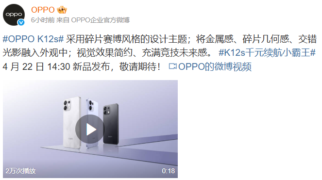 近日OPPO官方公布了OPPO K12s手机的三款配色:星芒白,玫瑰紫,棱镜黑,新机将于4月22日14:30正式发布。
