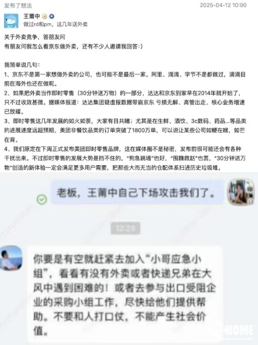 4月12日美团核心本地商业CEO王莆中在其社交平台评论称:“京东不是第一家想做外卖的公司,也可能不是最后一家”,并且直言“美团非餐饮品类的订单突破了1800万单,可以说让某些公司如鲠在喉,如芒刺背”,随后京东高管将王莆中的评论发给了刘强东,刘强东表示:不要打口水战,不能产生社会价值。