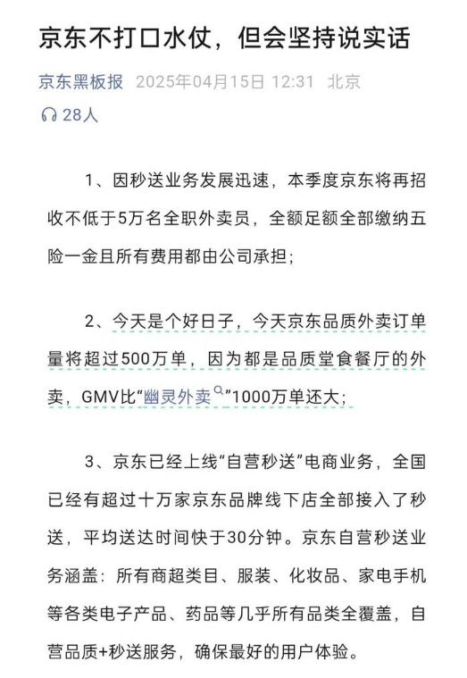 同日京东回应,“不打口水战,但坚持说实话”,并表示将再招收5万名全职外卖骑手,承担其全部的五险一金费用,还称“今日是京东外卖订单量突破500万的日子,GMV比‘幽灵外卖’的1000万还大”。