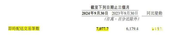 截止2024年末,美团闪购已和5600家大型连锁零售商,41万本地小商户以及超570家品牌商达成合作,其中2024年第二季度即时配送订单数达62亿单,同比增长14.2%;第三季度订单总量71亿,同比增长14.5%,这样来看确实是呈现上升趋势。