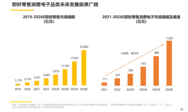 据《即时零售消费电子行业白皮书》显示,过去3年,消费电子品类在即时零售市场获得了高速增长,预计2021—2026年,年均复合增长率达68.5%,2026年即时零售消费电子行业规模将超千亿。