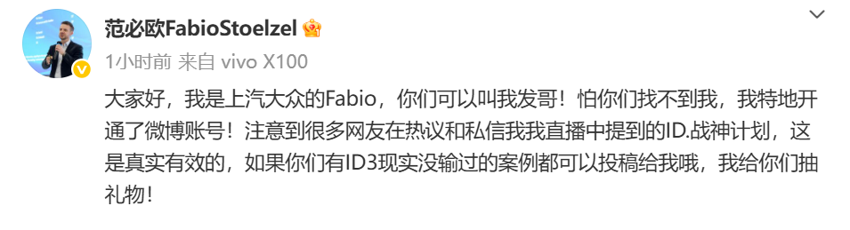 4月18日消息,上海上汽大众汽车销售有限公司副总经理,德国籍高管范必欧FabioStoelzel用中文进行直播,回答网友提问,其中,针对近期一起大众ID.3被追尾事故中的表现回应,坦言大众在营销宣传上“吃亏”,随后他网友推出“ID战神计划”,征集真实案例验证产品安全性,并为提供者提供奖励。随后,范必欧FabioStoelzel开通微博帐号,直言计划真实有效。