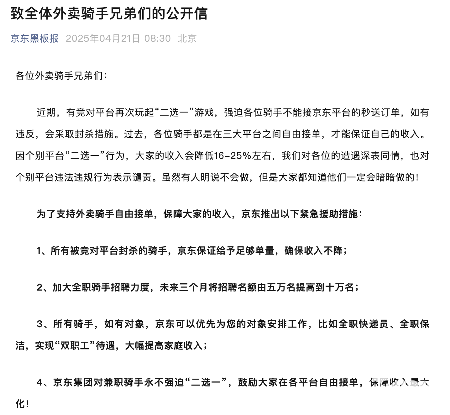 2025年4月21日,京东黑板报发布《致全体外卖骑手兄弟们的公开信》称,有竞对平台再次玩起“二选一”游戏,强迫各位骑手不能接京东平台的秒送订单,如有违反,会采取封杀措施。