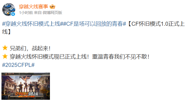 4月21日消息,腾讯游戏官方今日在其社交平台官宣《穿越火线》怀旧模式1.0正式上线。