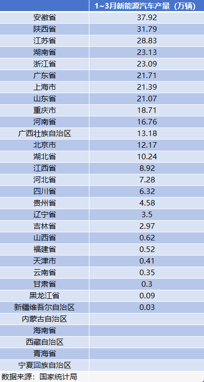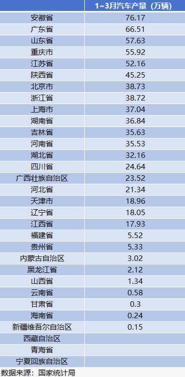近日,据国家统计局数据库,今年1至3月各省份汽车产量排名中,安徽省以76.17万辆位居全国第一,第二位广东省66.51万辆。新能源汽车产量榜单中,安徽省以37.92万辆位居全国第一,第二位陕西省31.79万辆。据估算,安徽省今年有可能在超越广东省,登顶全国汽车产量第一省的位置。