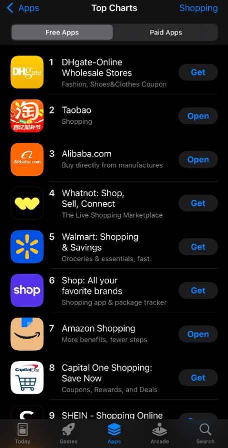 最新数据显示,阿里国际站(Alibaba.com)已经超越沃尔玛,成为美国App Store中免费购物软件下载榜,下载量排名第三的应用。同时,淘宝排名该榜单第二名,排名第一是敦煌网,也是中国品牌,是B2B跨境电商在线交易服务平台,总部在北京,可谓美国App Store购物榜单被中国电商平台“霸榜”。