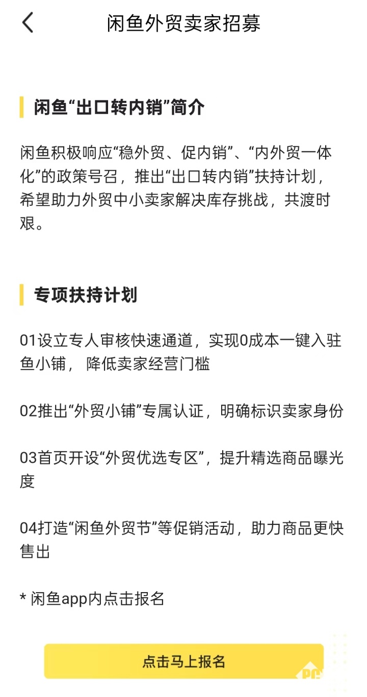 外贸卖家可以通过咸鱼首页“外贸优选”专区进行报名,或在闲鱼设置栏认证招商入口找到专属入驻通道。入驻的卖家均可以获得“外贸小铺”的认证标签,有利于消费者能够更快地识别到外贸商品。