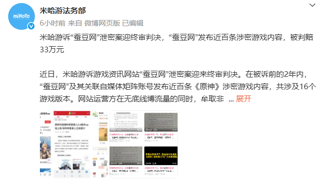 据米哈游法务部发布公告表示,游戏资讯网站“蚕豆网”及其关联自媒体矩阵账号发布近百条《原神》涉密游戏内容,共涉及16个游戏版本。米哈游诉“蚕豆网”迎来终审判决,一、二审法院均判决认定,“蚕豆网”的行为侵犯米哈游的著作权,并构成不正当竞争,要求“蚕豆网”运营方发布声明消除影响,并赔偿经济损失33万元。