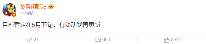 4月21日消息,今日博主@数码闲聊站在其社交平台暗示称:“目前暂定在5月下旬,有变动我在更新”。
