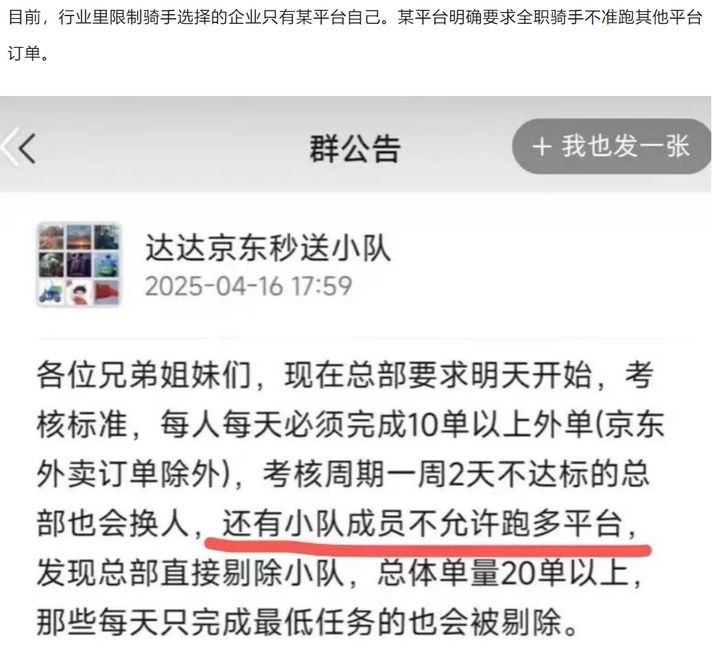 4月21日晚间,美团官方发文回应骑手“二选一”的情况,称全球没有任何平台有动力、有能力去约束外卖骑手的接单选择。美团从未限制骑手在饿了么上接单,未要求骑手不跑闪送、顺丰等其他即时配送平台,同样更没有任何理由对某平台进行任何限制。反呛对手称,目前,行业里限制骑手选择的企业只有某平台自己。某平台明确要求全职骑手不准跑其他平台订单。