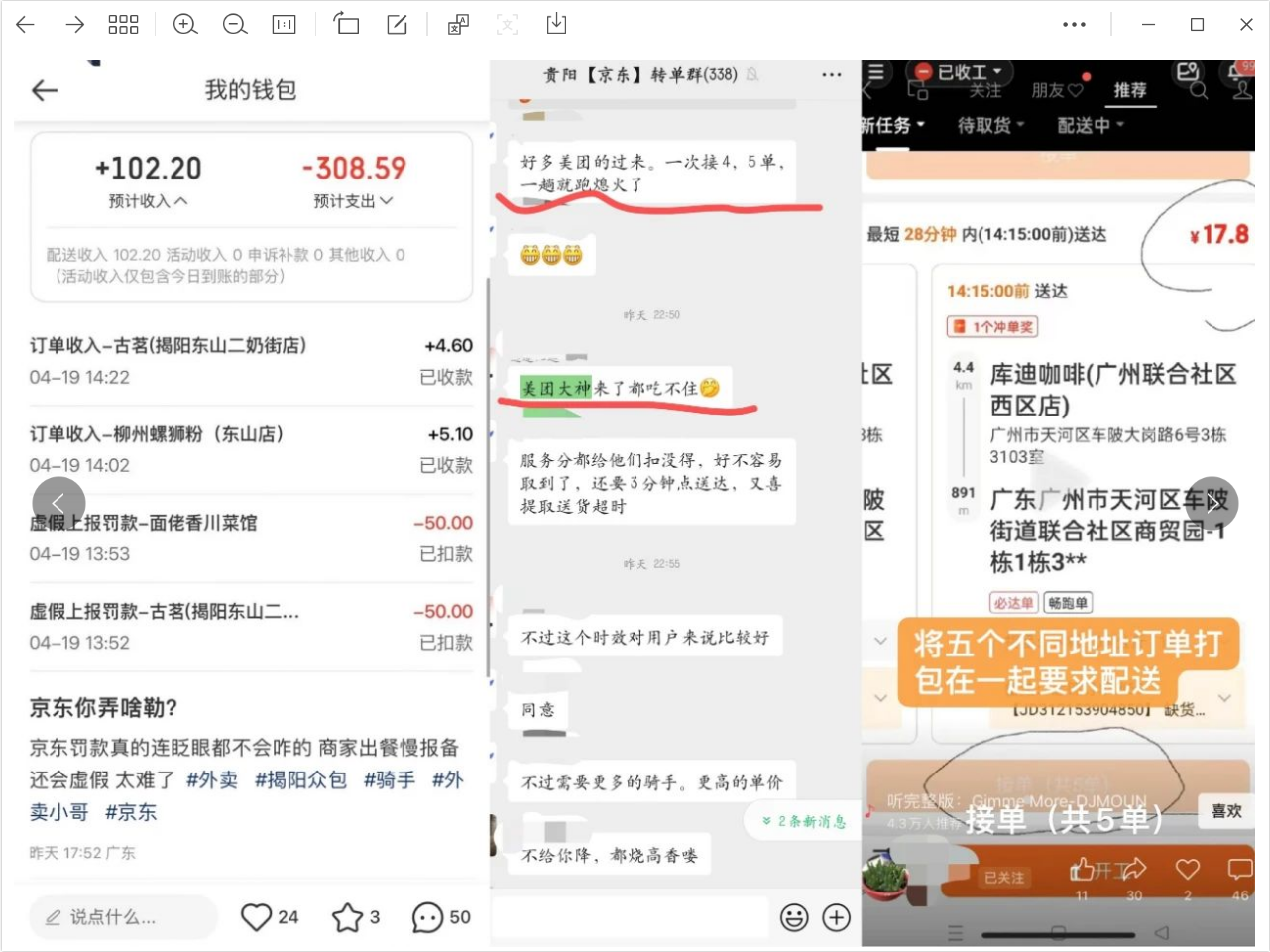 据美团官方账号发文称,某平台配送延误问题主要是自身原因,某平台对超时骑手进行了大额罚款,甚至经常出现扣罚骑手400元的情况。某平台配送时限过短、全职骑手数量不足、兼职骑手被区别对待,加上罚款严重,将不同地址非顺路多笔订单打包捆绑要求配送等问题,导致骑手不愿加入,延误问题高发,用户体验受损。如,有美团骑手表示,“美团大神来了都吃不住”。