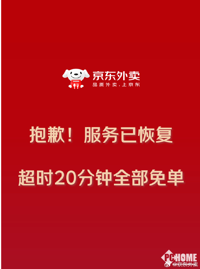 京东官微对外表示:因今日午高峰京东外卖下单量暴增,导致系统出现短暂故障,目前已全面恢复,大家可以正常下单了。为表达歉意,所有超时20分钟以上的外卖订单,京东全部免单。
