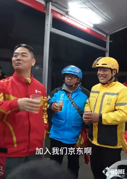 吃饭时,有美团、饿了么的骑手向刘强东敬酒,美团骑手表示:“希望早日加入京东。”刘强东则回应:“欢迎美团、饿了么兄弟加入京东。”随后,美团骑手当场套上京东外卖服。