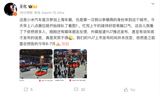 对此,小米公关部总经理王化在社交媒体发文称,“我们的YU7上市发布时间并未改变,依然是之前雷总预告的今年6-7月。”