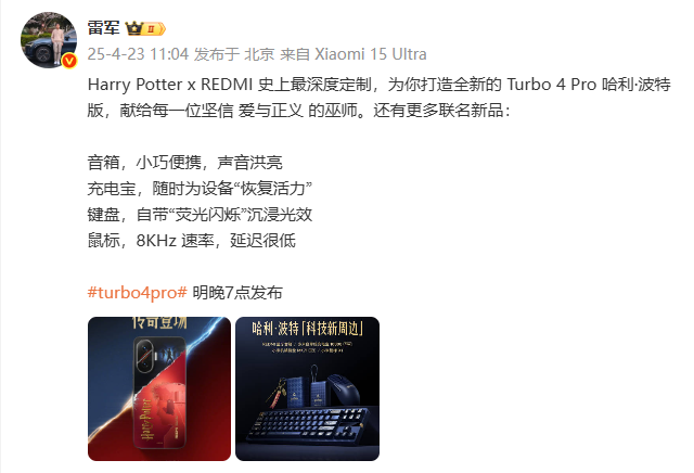 4月23日消息,小米创始人,雷军在社交平台发文预告,Harry Potter x REDMI史上最深度定制,即将推出全新的Turbo 4 Pro哈利·波特版,明晚7点Turbo 4 Pro新品发布会。