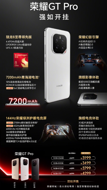 据悉,荣耀GT Pro配备绿洲护眼电竞屏幕,支持432Hz屏幕响应频率,144Hz自适应可变刷新率,拥有2700Hz瞬时触控采样率,游戏操控又快又稳。续航方面,配备7200mAh青海湖电池,支持AI功耗自适应2.0,拥有SoC自研电压调节芯片、HONOR E2自研能效增强芯片,让打游戏、刷视频变得续航不焦虑。