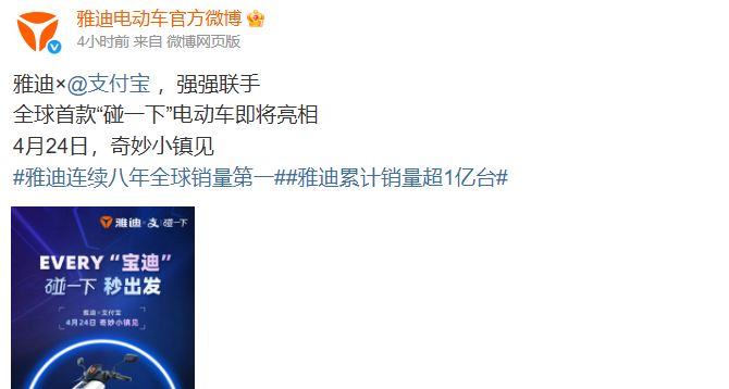 4月23日消息,雅迪电动车今日官宣与支付宝合作,全球首款“碰一下”电动车将在明日亮相。