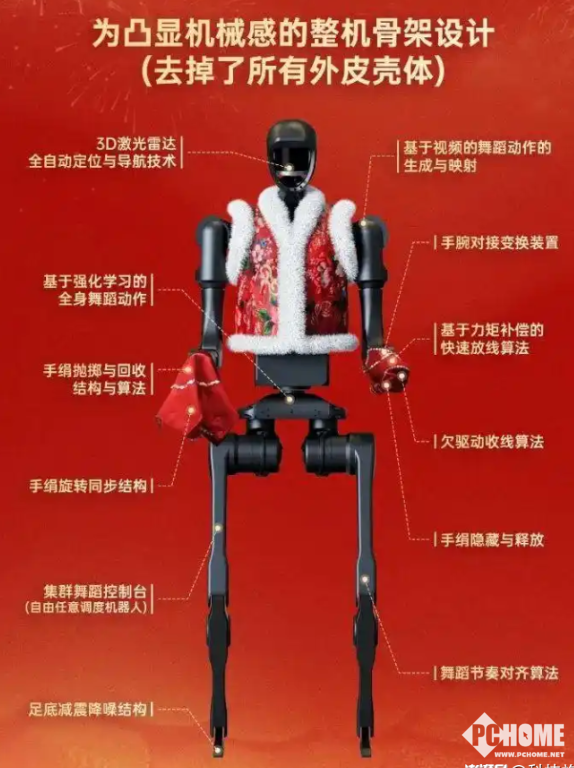 2025年春晚,张艺谋导演的节目《秧BOT》登上春晚,16台宇树H1机器人身着陕北秧歌服进入舞台,人机同台表演,很快上了微博热搜。为凸显机械感的整体骨架设计,HI机器人去掉所有外衣壳体,并采用全走动定位导航技术,基于视频的舞蹈动作的生成映射,手绢旋转的同步结构与隐藏释放,舞蹈节奏对其算法等,为观众们演绎智能时代下的中国舞蹈,实数精彩。