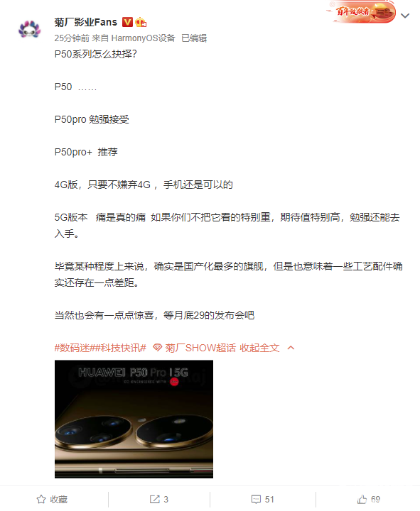 数码博主 @菊厂影业 Fans 今日表示,华为 P50 系列中的基础版性价比一般,而 P50 Pro 和 P50 Pro+ 更值得推荐,该系列机型确实将于 7 月 29 日发布。