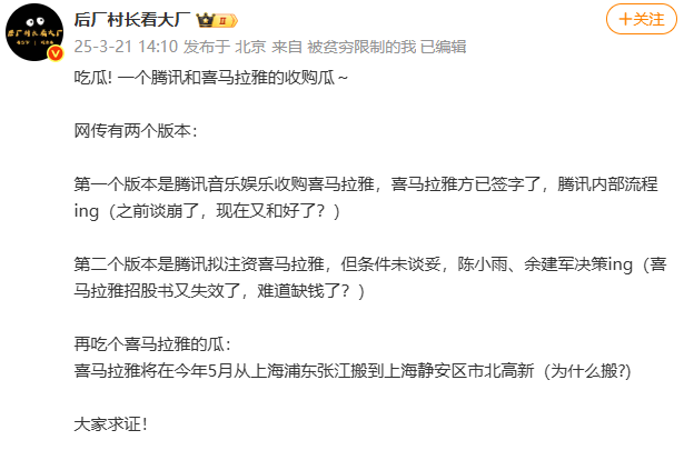 今年3月底,曾有知名博主爆料,腾讯音乐与喜马拉雅就收购进行洽谈,传言有两个版本,第一个版本是腾讯音乐娱乐收购喜马拉雅,喜马拉雅方已签字了,腾讯内部流程。第二个版本是腾讯拟注资喜马拉雅,但条件未谈妥。