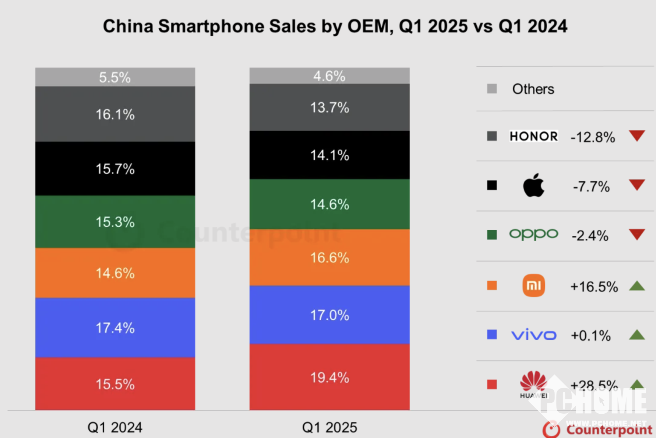 华为表现亮眼,以19.4%的市场份额拔得头筹,同比增幅达28.5%,创下自2021年以来的最高纪录。华为的出色成绩得益于多款产品的强劲表现。