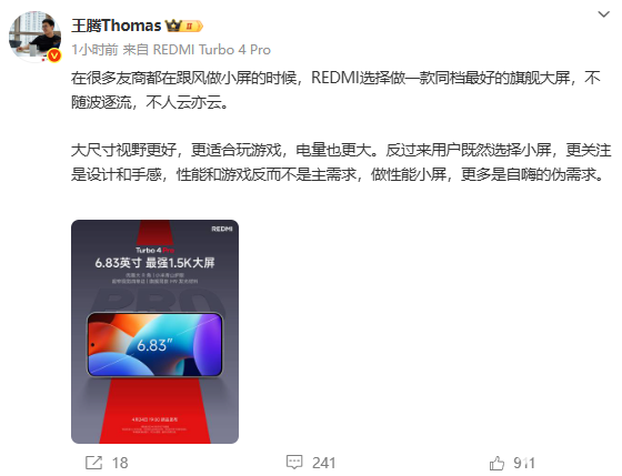 今早,小米中国区市场部总经理,REDMI品牌总经理王腾在其社交平台发文称:在很多友商都在跟风做小屏的时候,REDMI选择做一款同档最好的旗舰大屏,不随波逐流,不人云亦云。