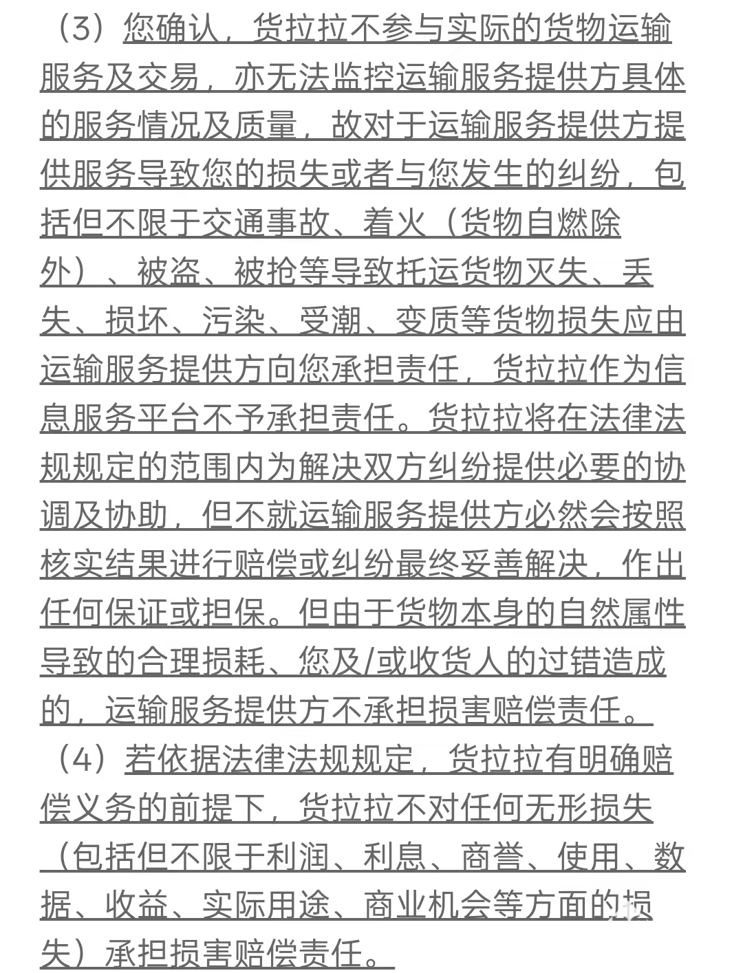 在货拉拉APP法律条款中,提到:货拉拉不参与实际的货物运输服务及交易,亦无法监控运输服务提供方具体的服务情况及质量,所以对货物损失应由运输服务提供方向您承担责任,货拉拉作为信息服务平台不予承担责任。
