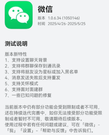 4月27日消息,鸿蒙版微信迎来1.0.6.34最新版本的更新,支持设置聊天背景、群聊保存到通讯录、设置朋友为星标或加入黑名单和面对面建群等功能。近一个月时间,鸿蒙版微信更新已超10余次,三天前刚刚迎来1.0.6.33版本邀请测试升级。