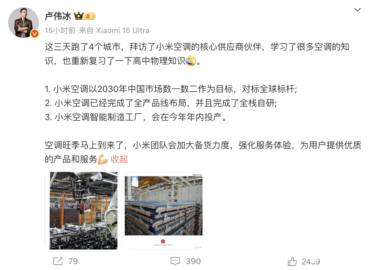卢伟冰在社交媒体平台发文称,“小米空调以2030年中国市场数一数二作为目标,对标全球标杆”。