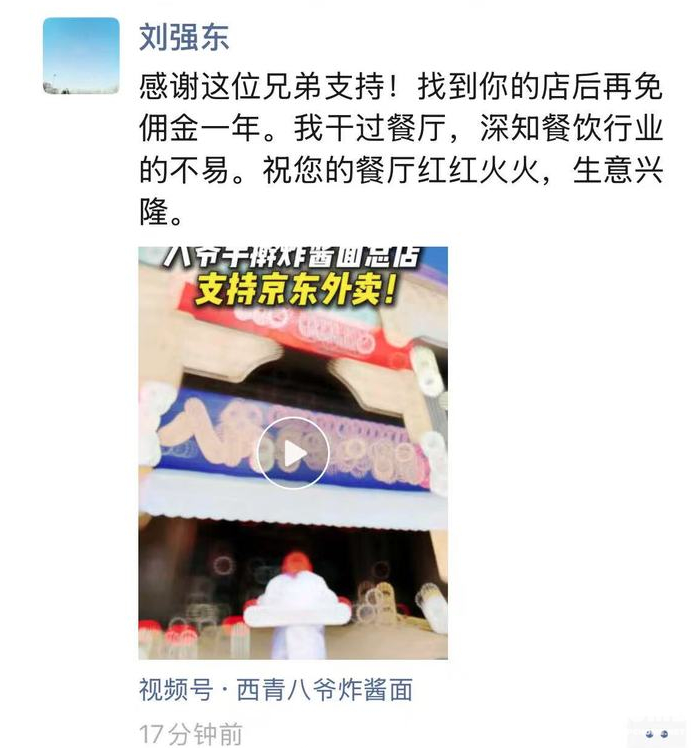 京东集团创始人刘强东在朋友圈公开支持一家餐饮商户,“感谢这位兄弟支持!找到你的店后再免佣金一年。我干过餐厅,深知餐饮行业的不易。”