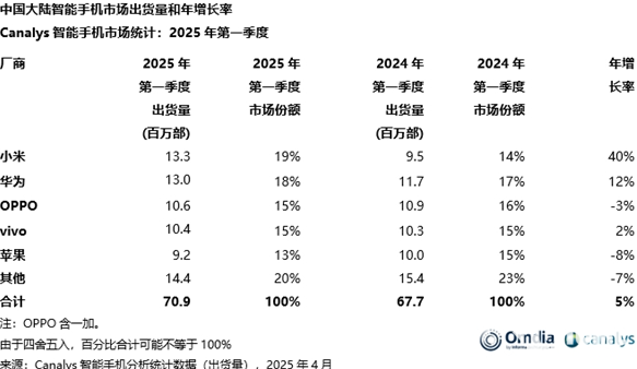 Canalys最新数据显示,2025年第一季度,中国智能手机市场出货量达7090万部,其中小米抢占第一,出货量达1330万部,同比增长40%,市场份额19%。华为位列第二,出货1300万部,OPPO、vivo分别以1060万部和1040万部的出货量位列第三和第四。
