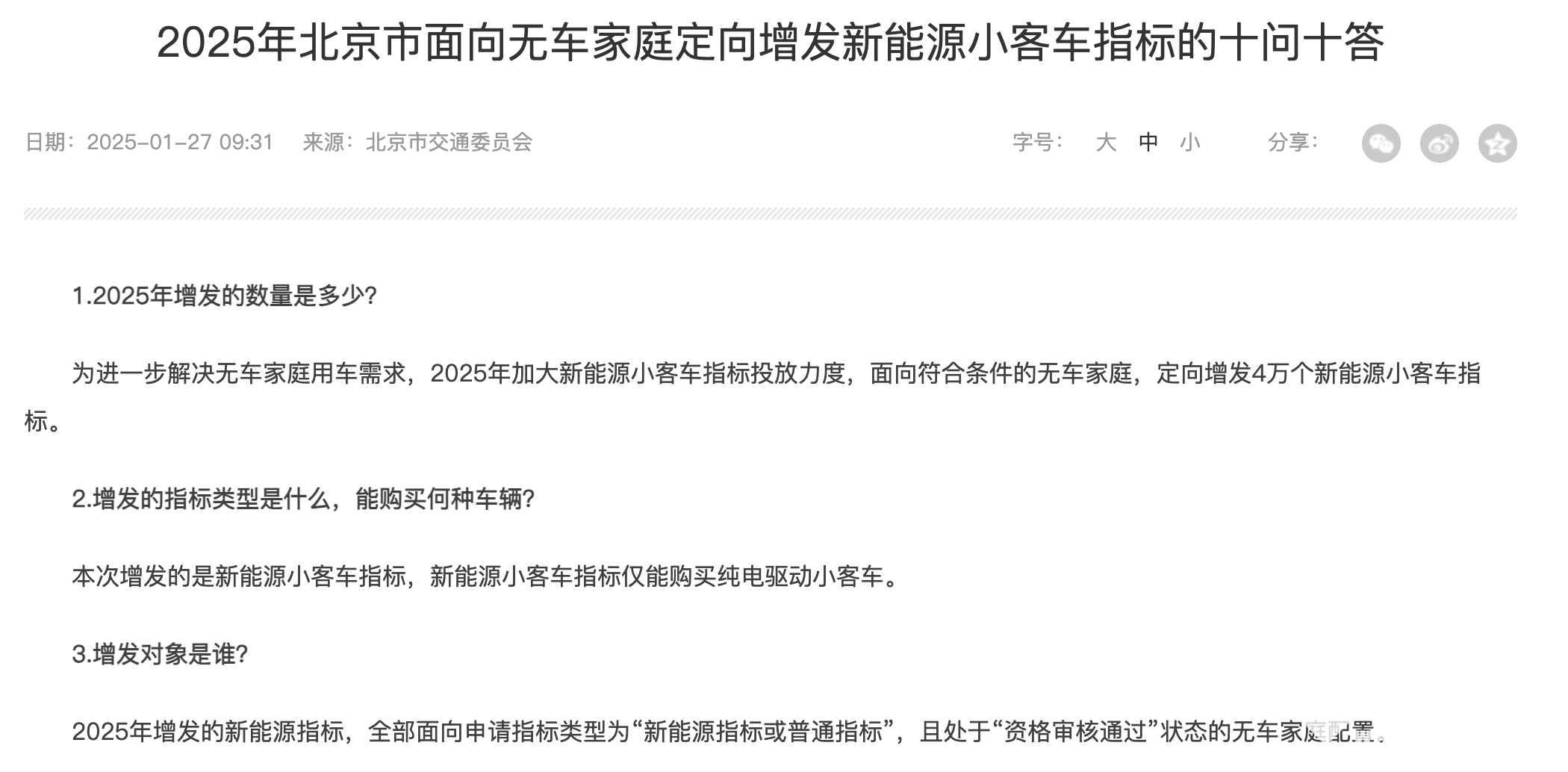据了解,近年来,已有诸多城市定向增发小客车指标。比如,为进一步解决无车家庭用车需求,北京市2025年加大新能源小客车指标投放力度,面向符合条件的无车家庭,定向增发4万个新能源小客车指标。