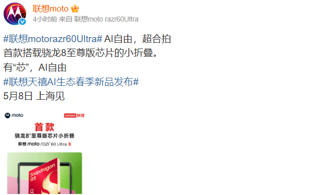 联想moto官方今日宣布moto razr 60 Ultra手机将于5月8日发布,新机号称“首款搭载骁龙8至尊版芯片的小折叠”。