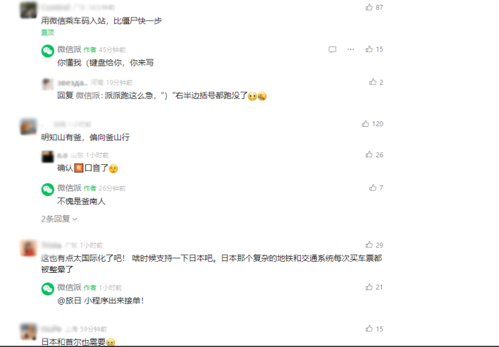 韩国釜山靠电影《釜山行》走红,成为众多游客网红打卡地,给观众留下了深刻的印象,此次微信程序可购买釜山车票,引得网友纷纷调侃,“用微信扫码入站,比僵尸更快一步”,另有网友表示期待日本和首尔也能尽快实现这个功能。