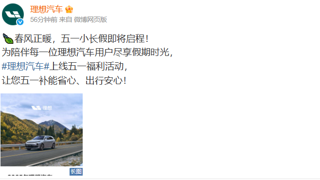 理想汽车今日宣布,五一假期期间,理想汽车全系车型在高速服务区理想超充站充电服务费全免,另外还有3张充电服务费6折优惠券发放,2025年5月1日至5月7日,全部理想充电站可用。