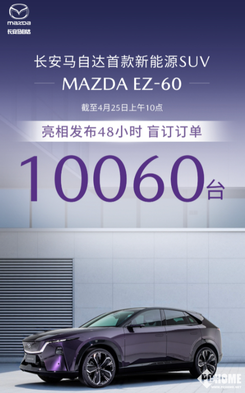4月28日消息,上海车展上长安马自达发布了首款新能源电车SUV MAZDA EZ-60,亮相即预定,发布48小时后,盲订订单量达10060台。