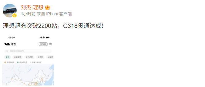 4月30日消息,理想汽车副总裁刘杰近日在社交平台发文:理想超充突破2200站,G318贯通达成。