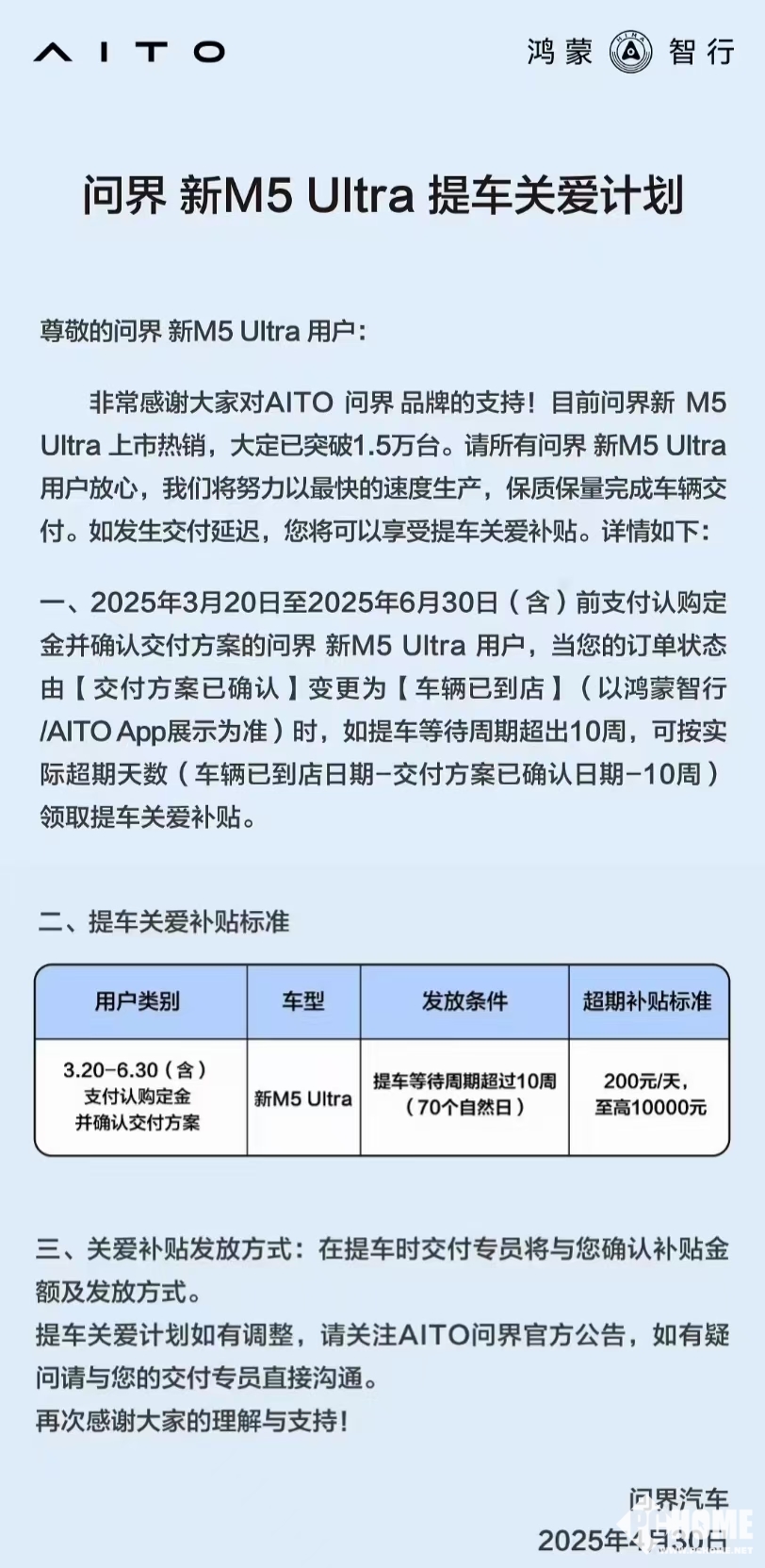 《问界新M5 Ultra汽车提车关爱计划》显示,3月20日至6月30日支付认购定金并确认支付方案的用户,等车超10周,超一天补贴200元,至高补贴1万元。